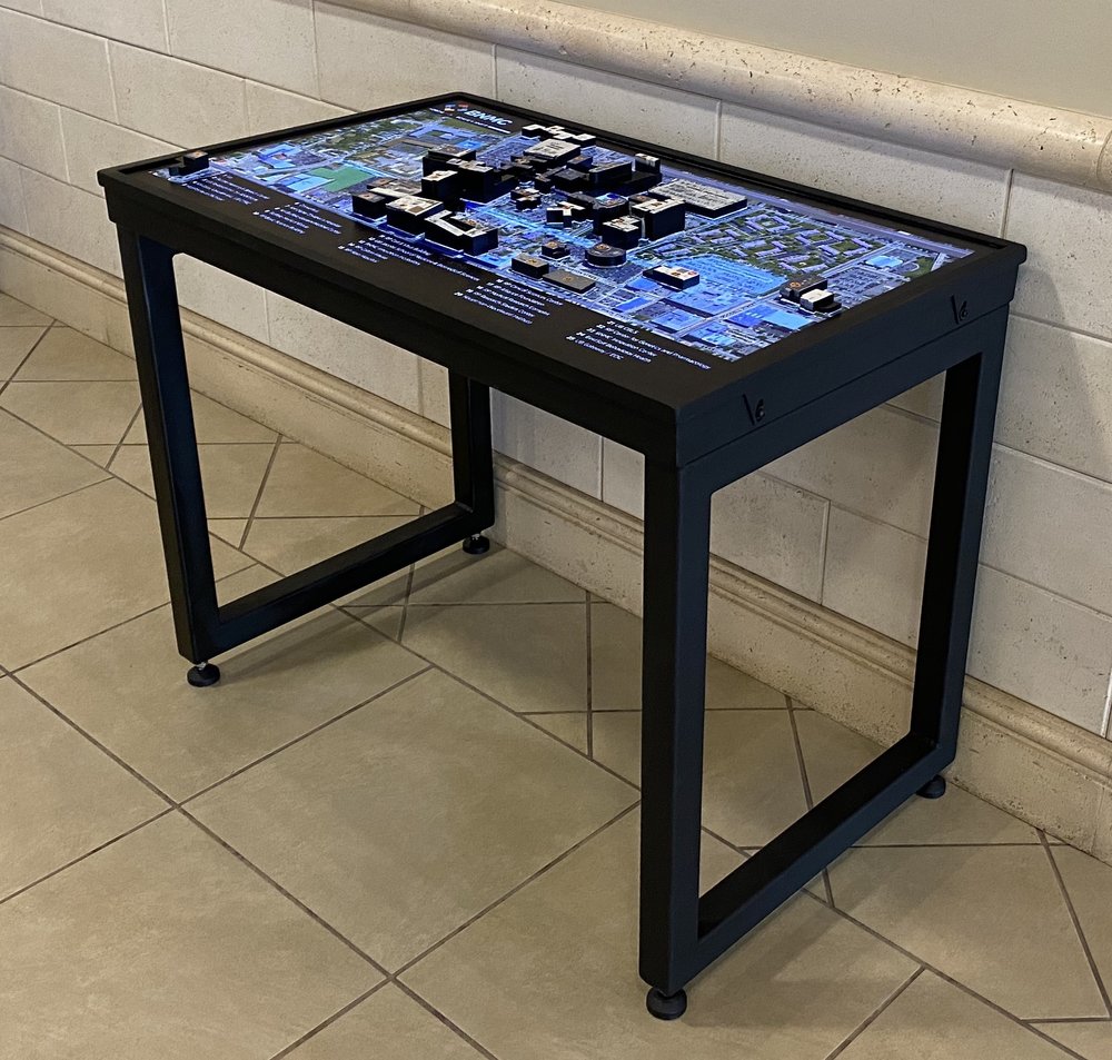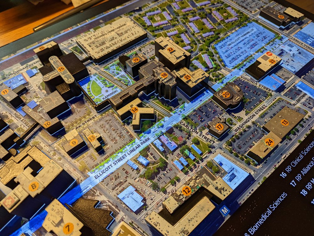 Now open. Patients and staff at this large urban health care campus find it hard to navigate here because of the large number of hospitals, all linked together by bridges that are widely used in the winter months. Touch Graphics created an orientation and way finding directory for display in the University’s Discovery Center, at the center of the medical campus. This interactive map allows users to touch 3D printed models of each building, and a visual/tactile skin. In response, they hear spoken names, descriptions and walking directions to any destination. An index of major buildings appears at the bottom of the map. When users touch one of the index entries, that place on the map lights up. For visually impaired users, a rising pitch tone assists in locating search targets.