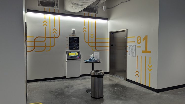 UV-printed tactile skin with floor plan showing elevators, stairs, restrooms, micro kitchens, cafes, and large gathering spaces.
