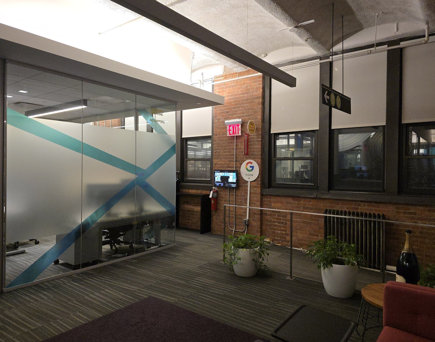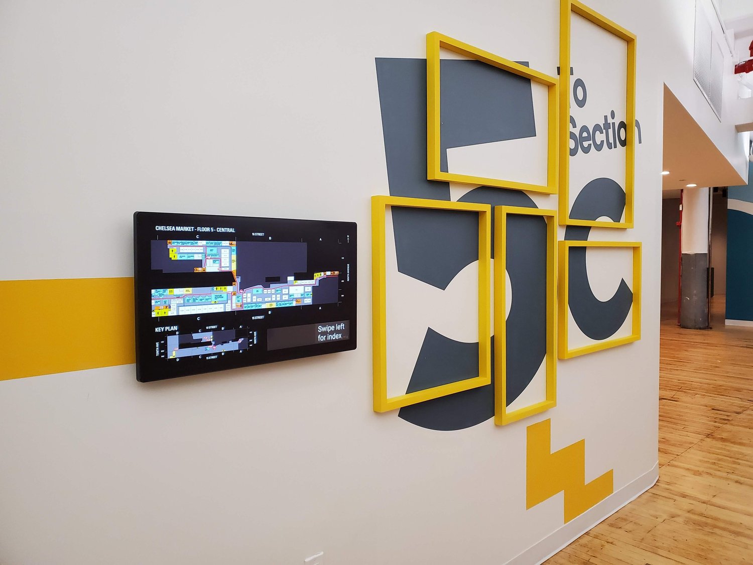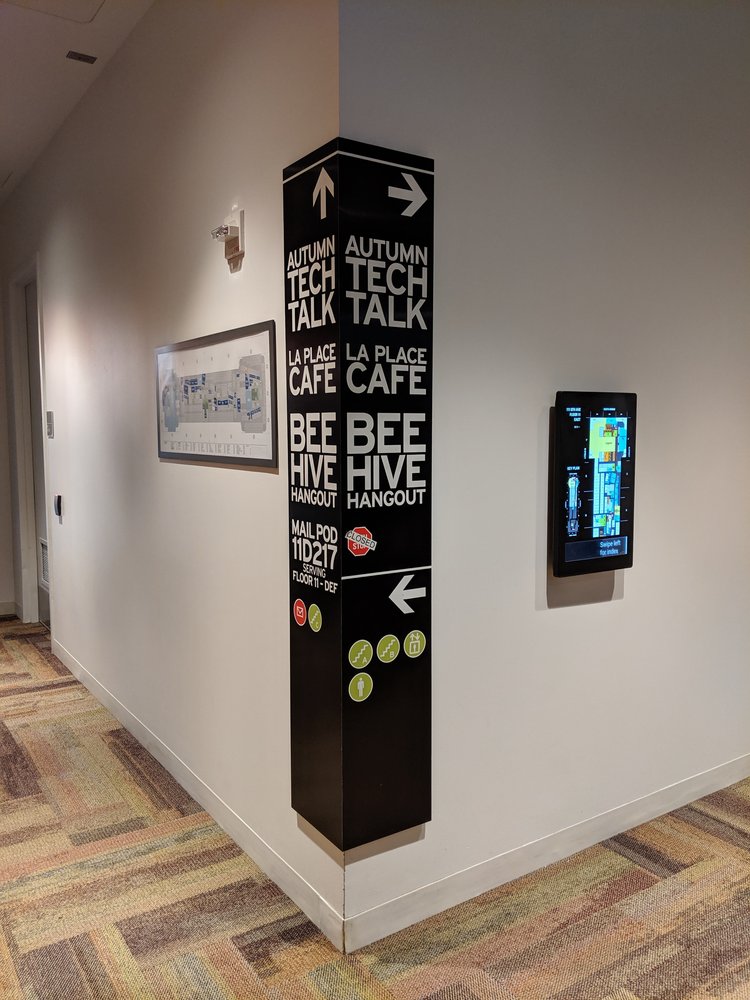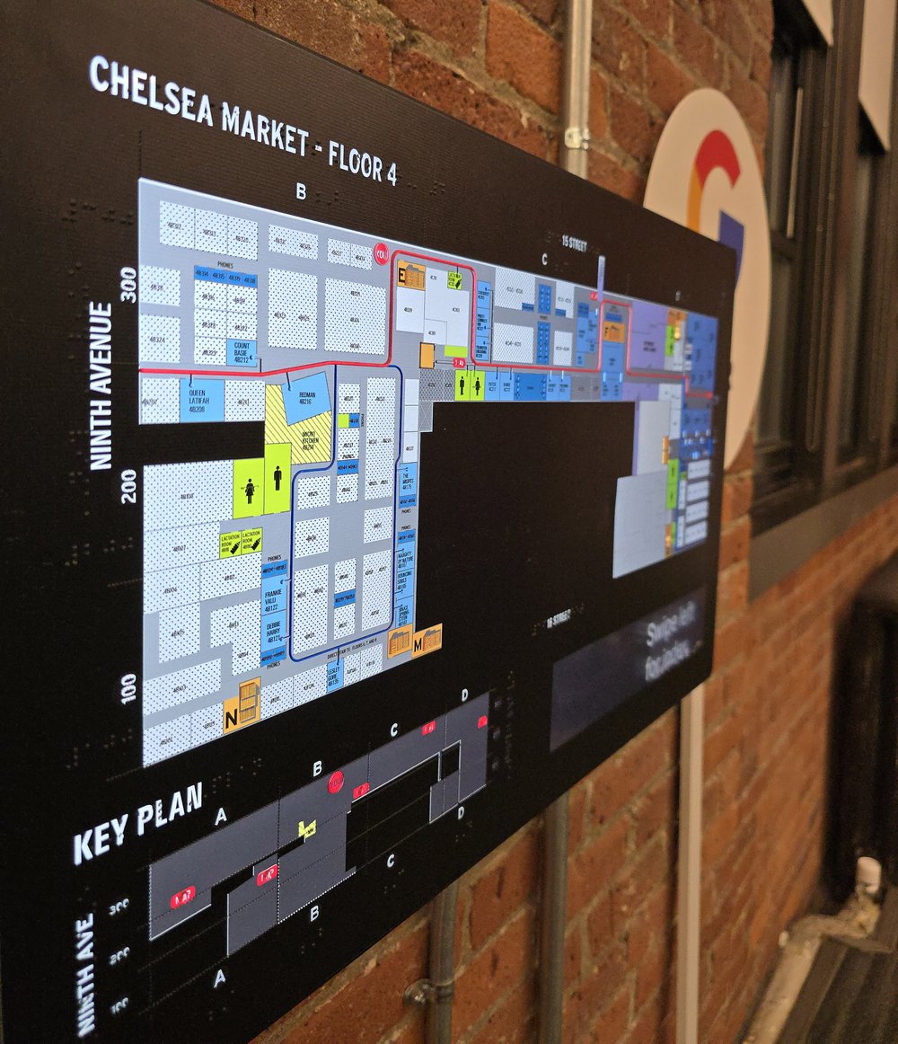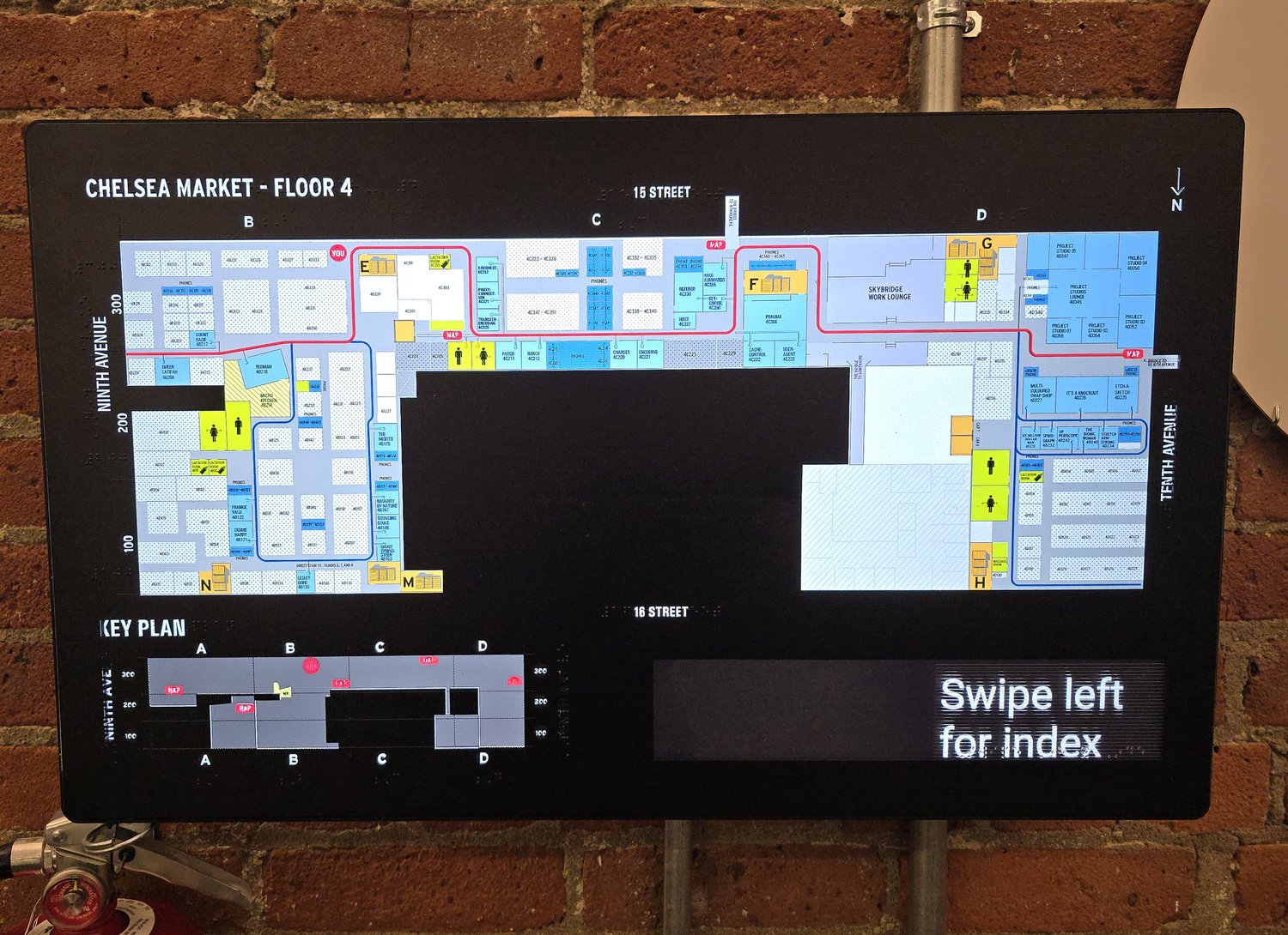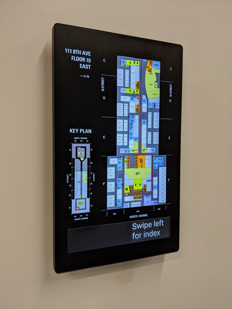A network of 120 interactive talking tactile maps shows the layout of offices throughout the campus of a large technology company in New York City. A swipeable index allows users to browse for a destination, and then follow a rising pitch tone to that conference room, restroom, elevator, micro kitchen or cafe.