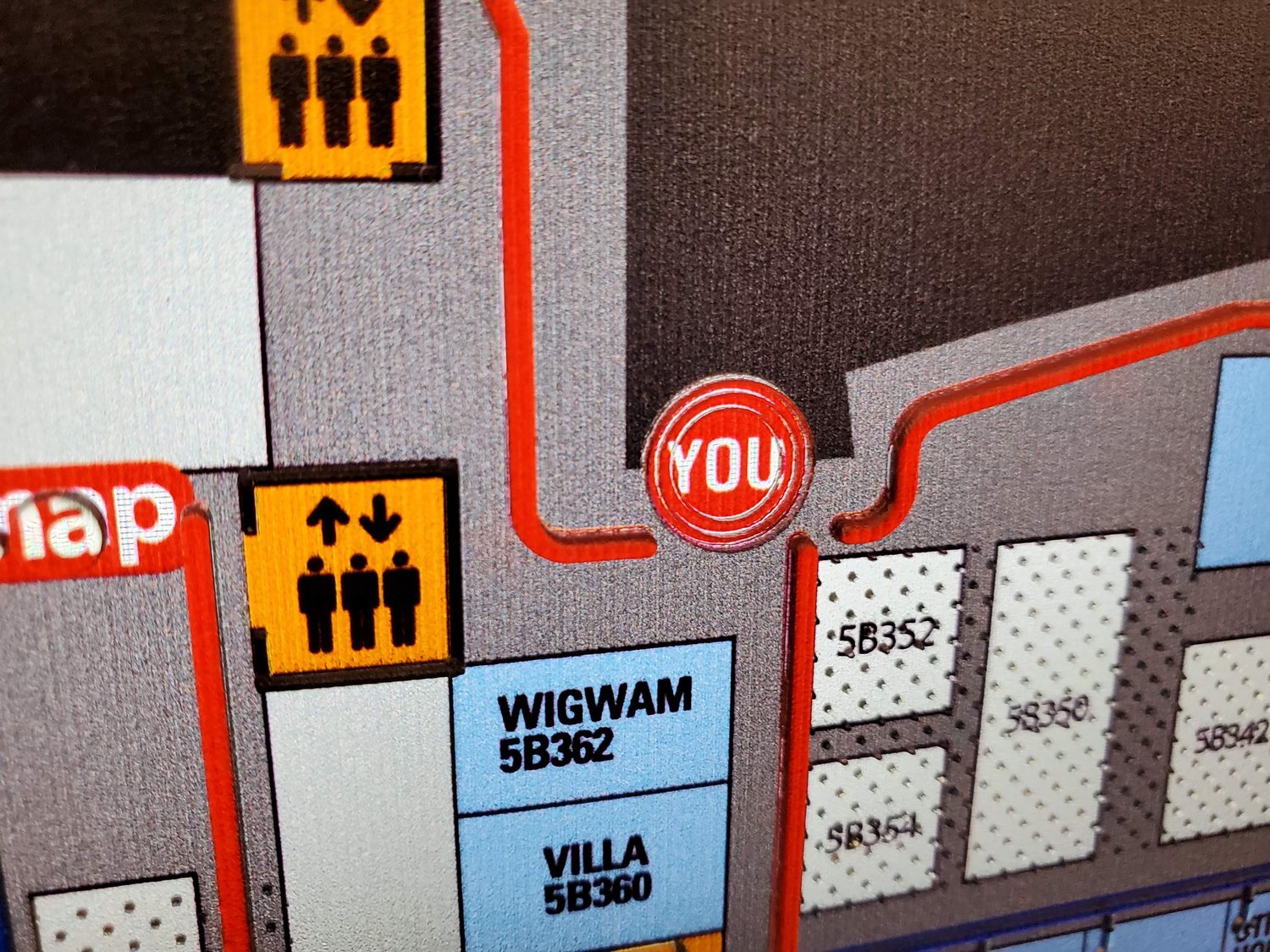 UV-printed tactile skin with floor plan showing elevators, stairs, restrooms, micro kitchens, cafes, and large gathering spaces.