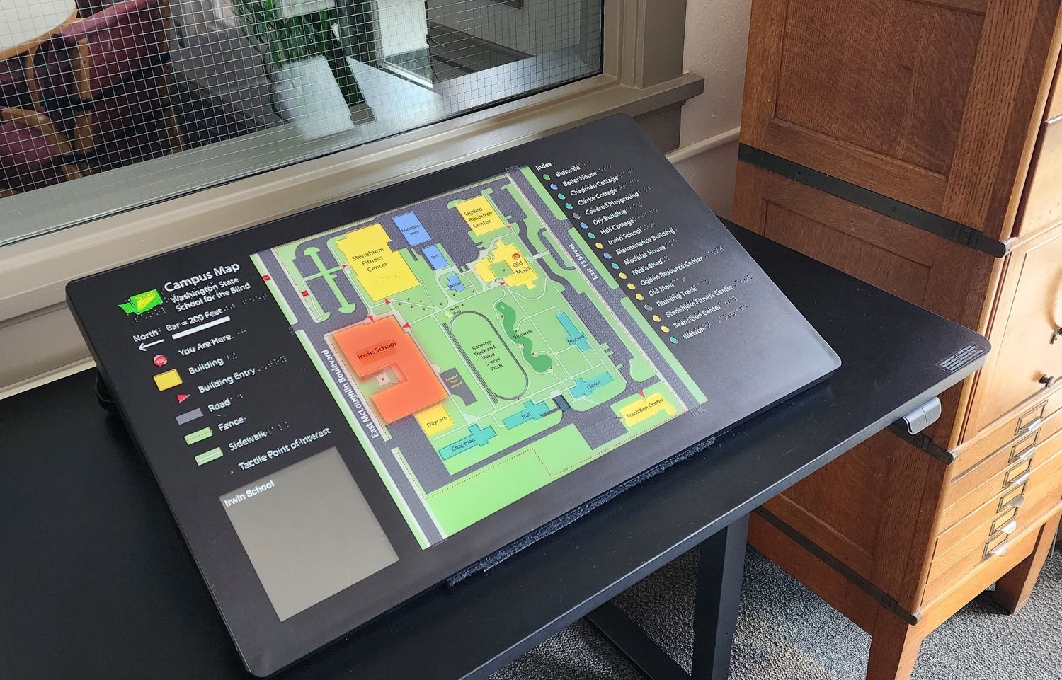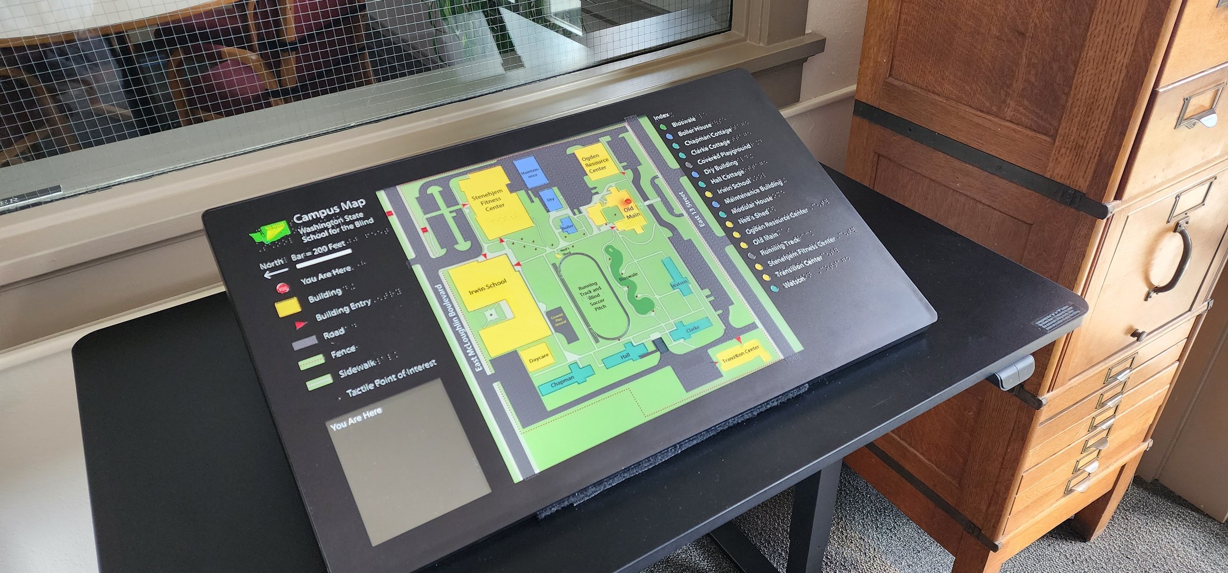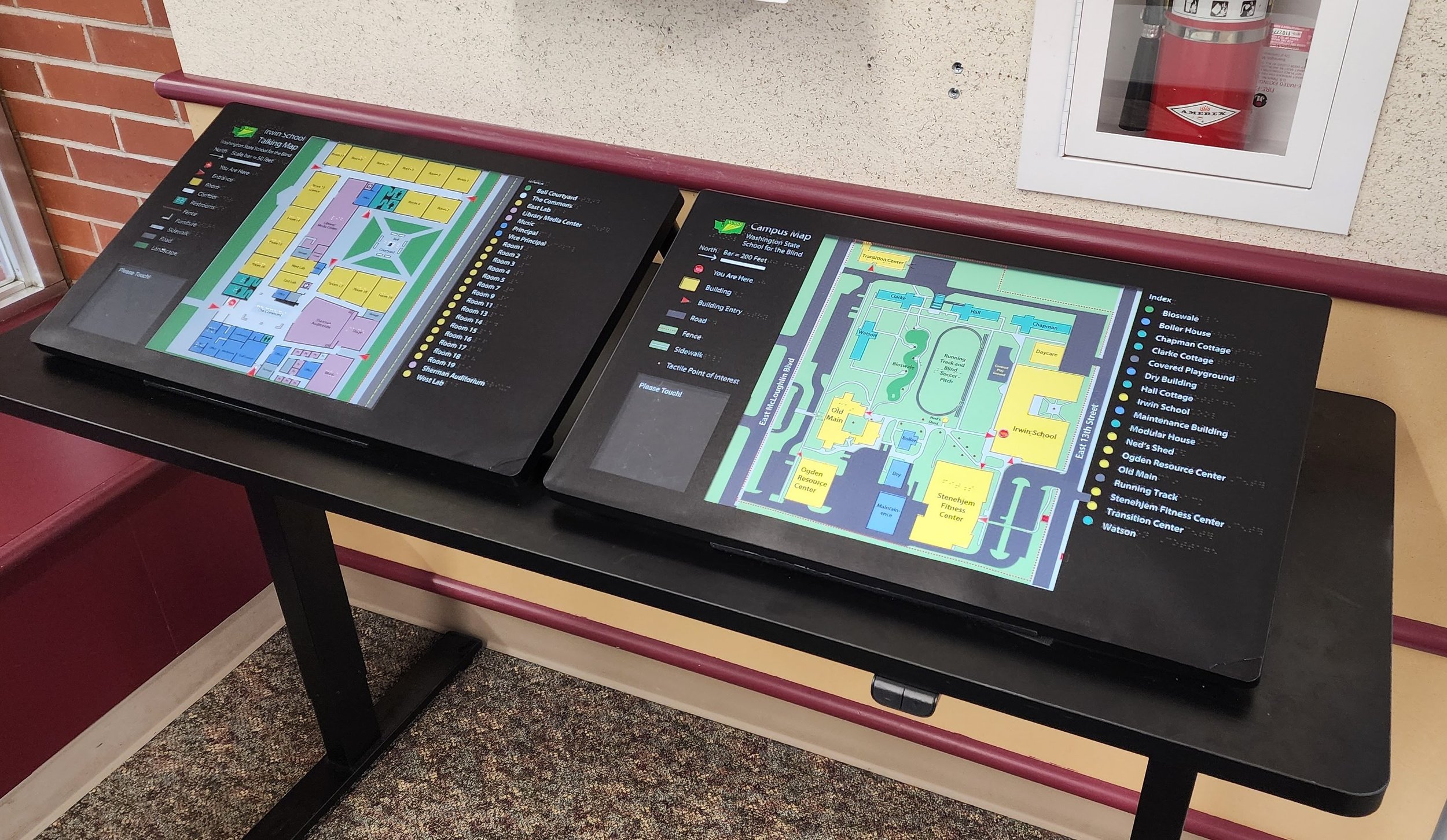 Working closely with the Superindent and O&M Trainers, Touch Graphics created five talking tactile maps showing the campus as a whole, and the interior of the main classroom building. The maps highlight “tactile points of interest”, touchable sculptures, fountains and braille signage scattered all over campus.